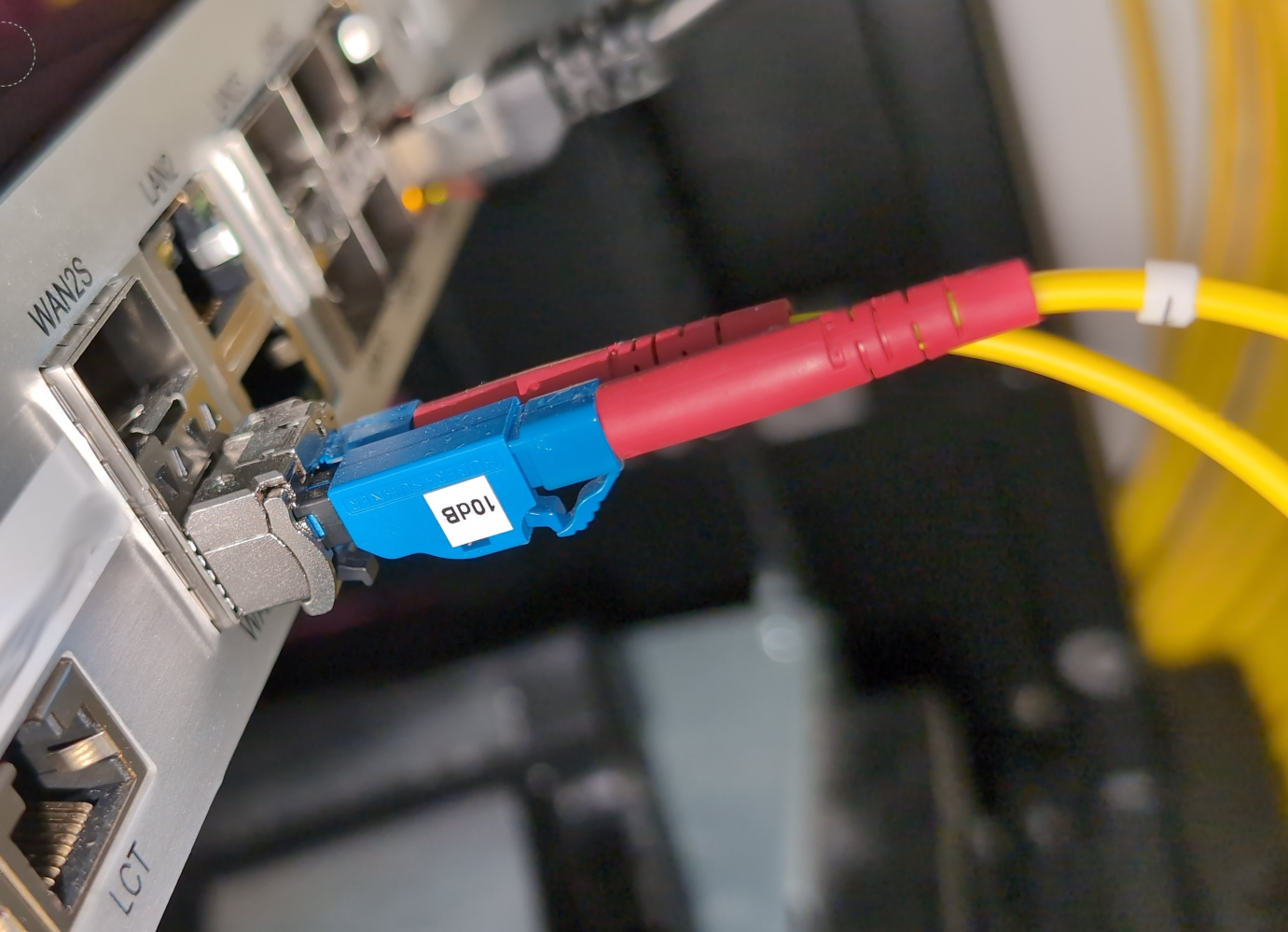 Uplink zum Provider (meist Glasfaser über SFP/LC). Darüber kommt dein Business-Anschluss rein.
