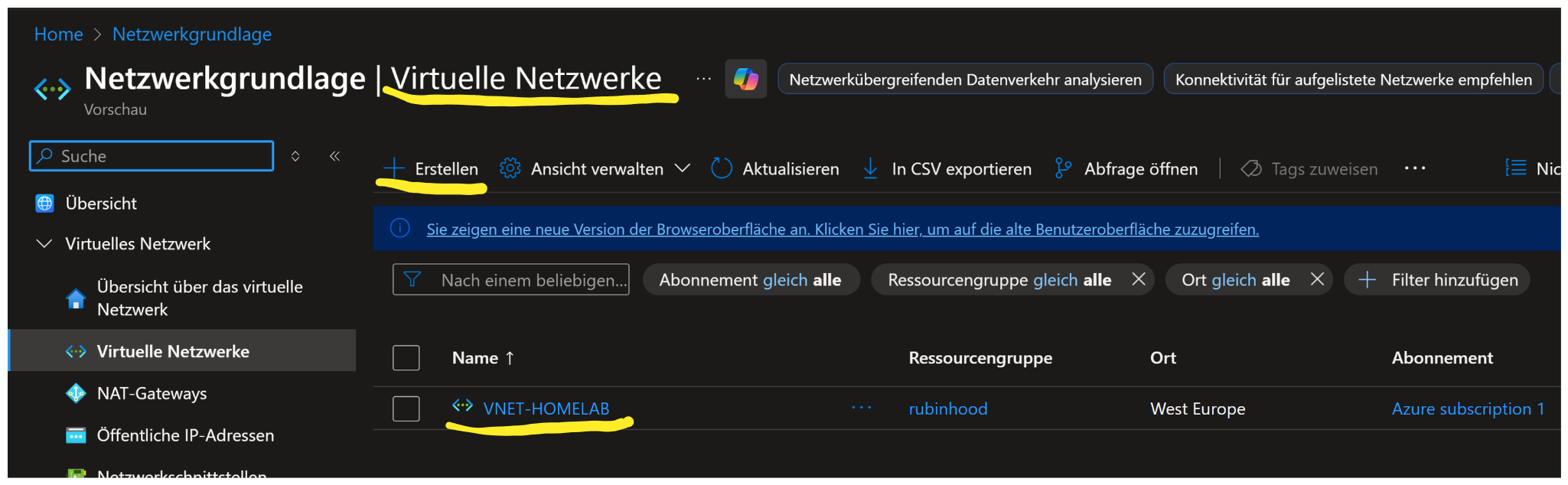 Azure Portal → Virtuelle Netzwerke → Erstellen