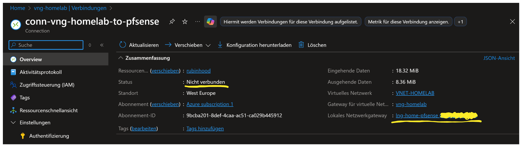 Erst die Connection “verheiratet” das Azure-Gateway mit deinem Home-Gateway (Local Network Gateway).