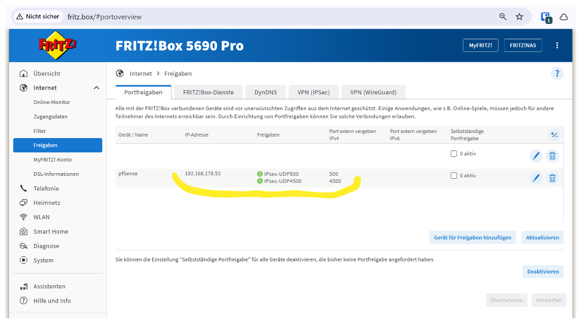FritzBox → Portfreigaben auf pfSense-WAN-IP (z.B. 192.168.178.52)