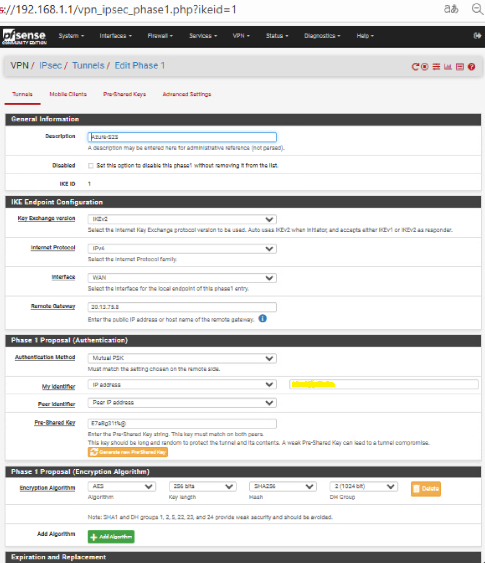 (Das ist das gemeinsame Passwort für den Tunnel. Muss später 1:1 in pfSense identisch sein.)