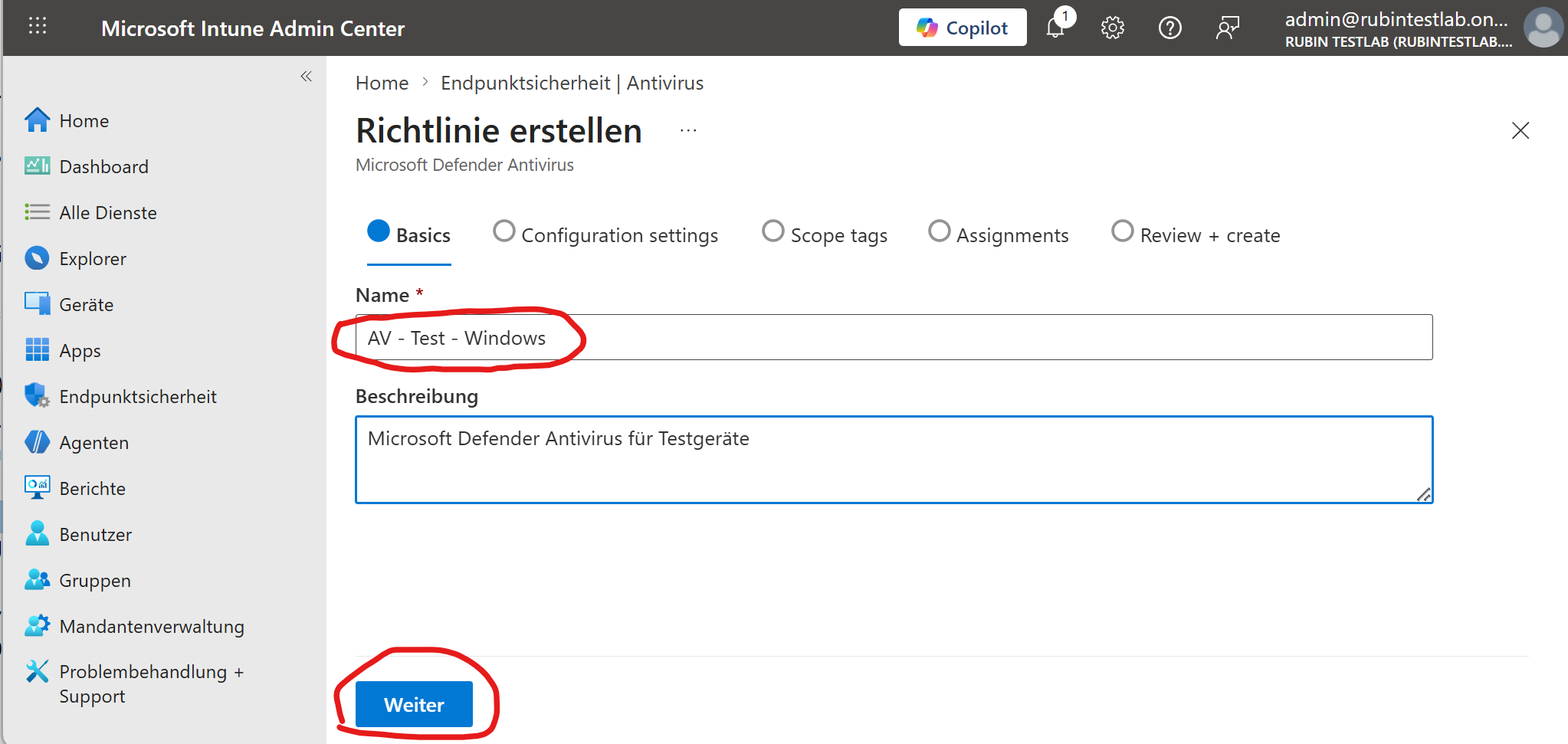 Endpunktsicherheit → Antivirus → Richtlinie erstellen