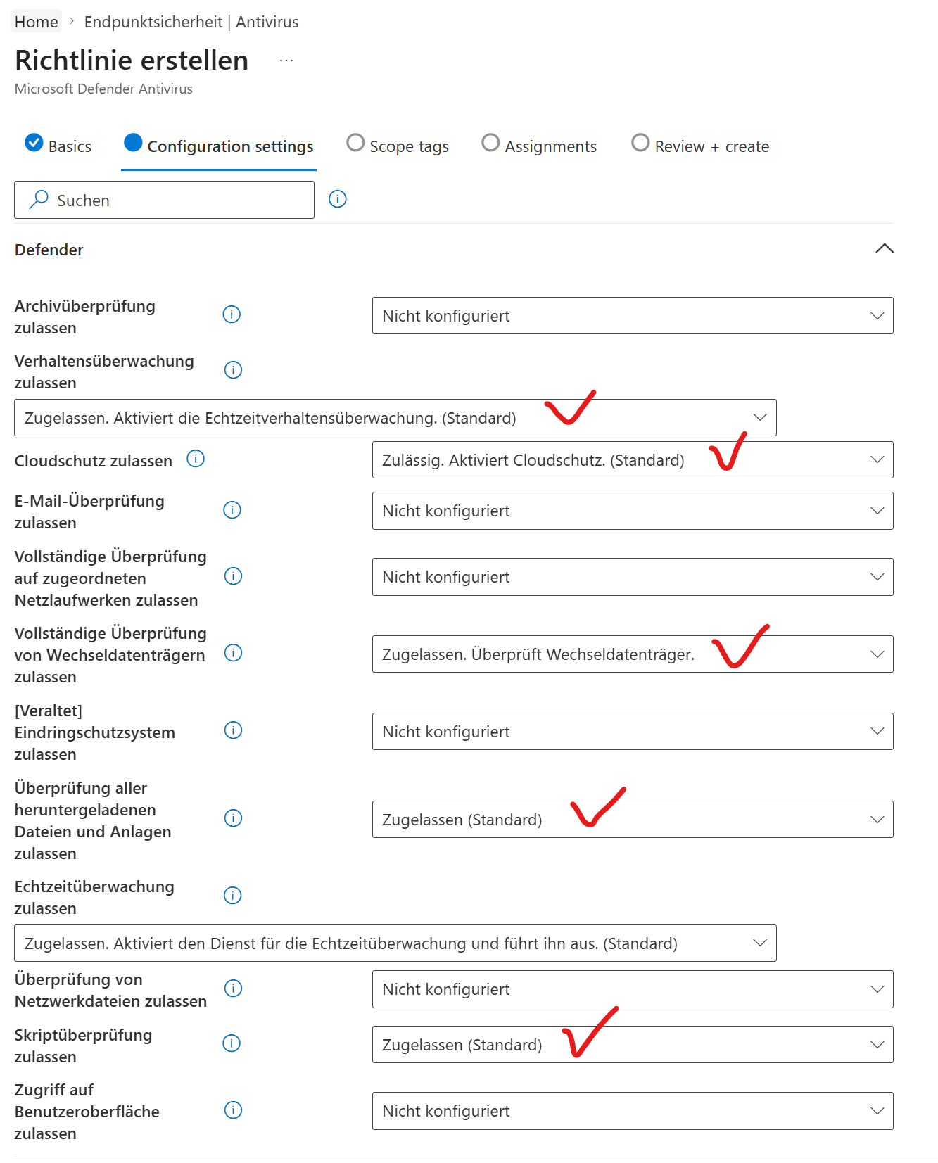 Bei den Konfigurationseinstellungen musst du nicht alles anfassen. Für eine erste saubere Test-Richtlinie reicht es, nur die wichtigsten Punkte zu setzen.