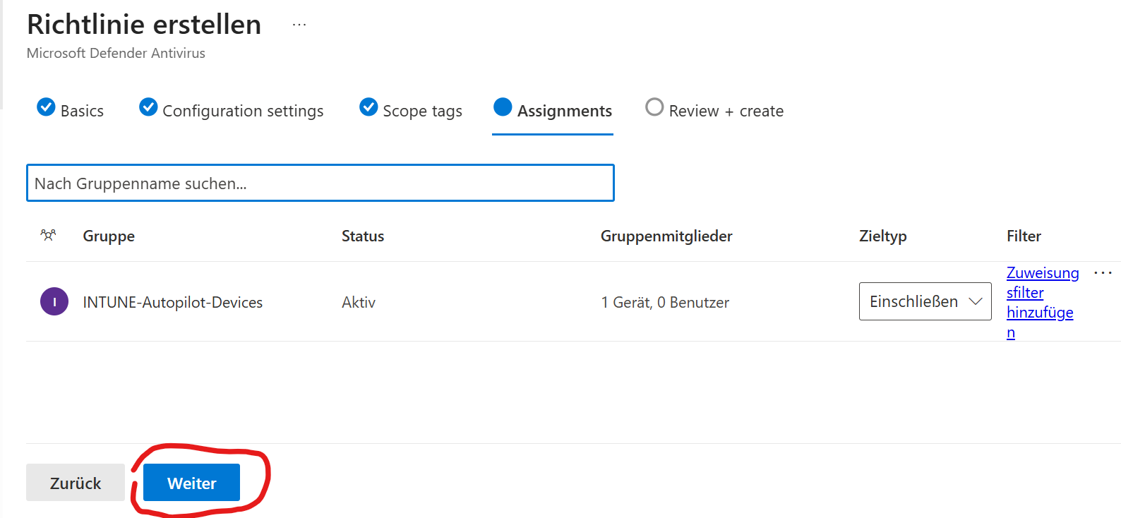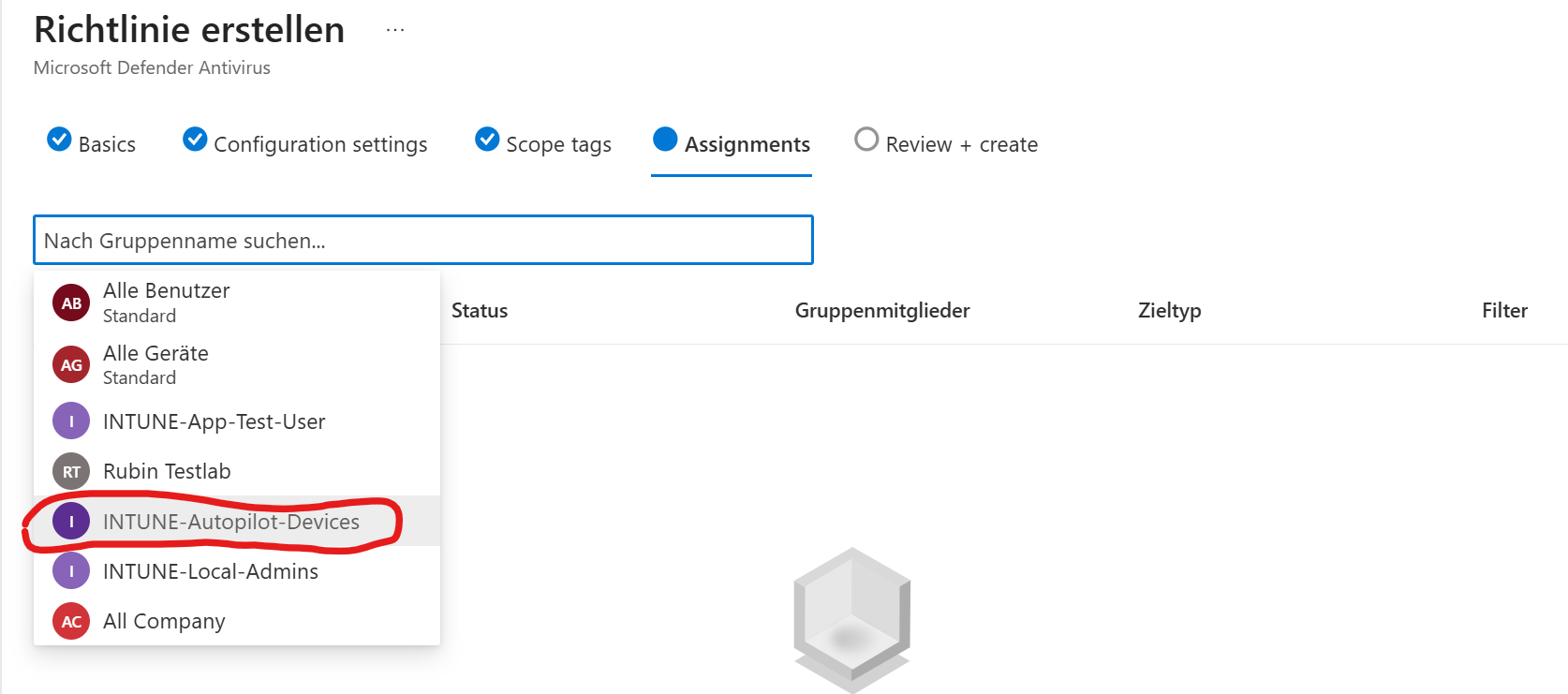 Wichtig ist, dass du hier eine Gerätegruppe auswählst und keine Benutzergruppe. Die Richtlinie soll schließlich auf dem Gerät landen und nicht nur dekorativ im Portal herumliegen.
