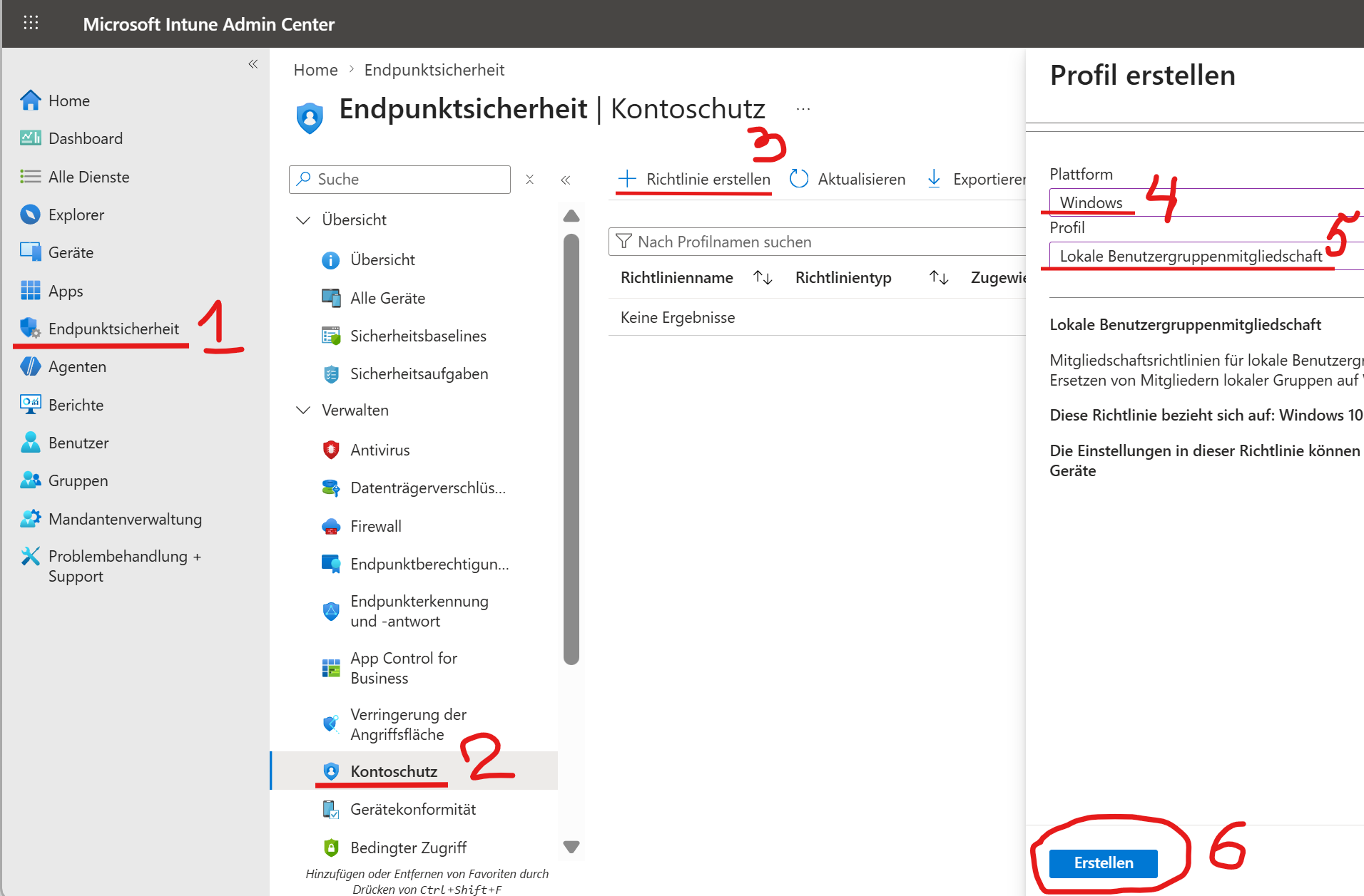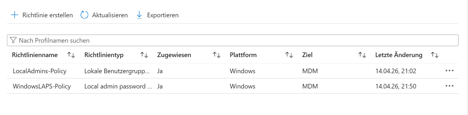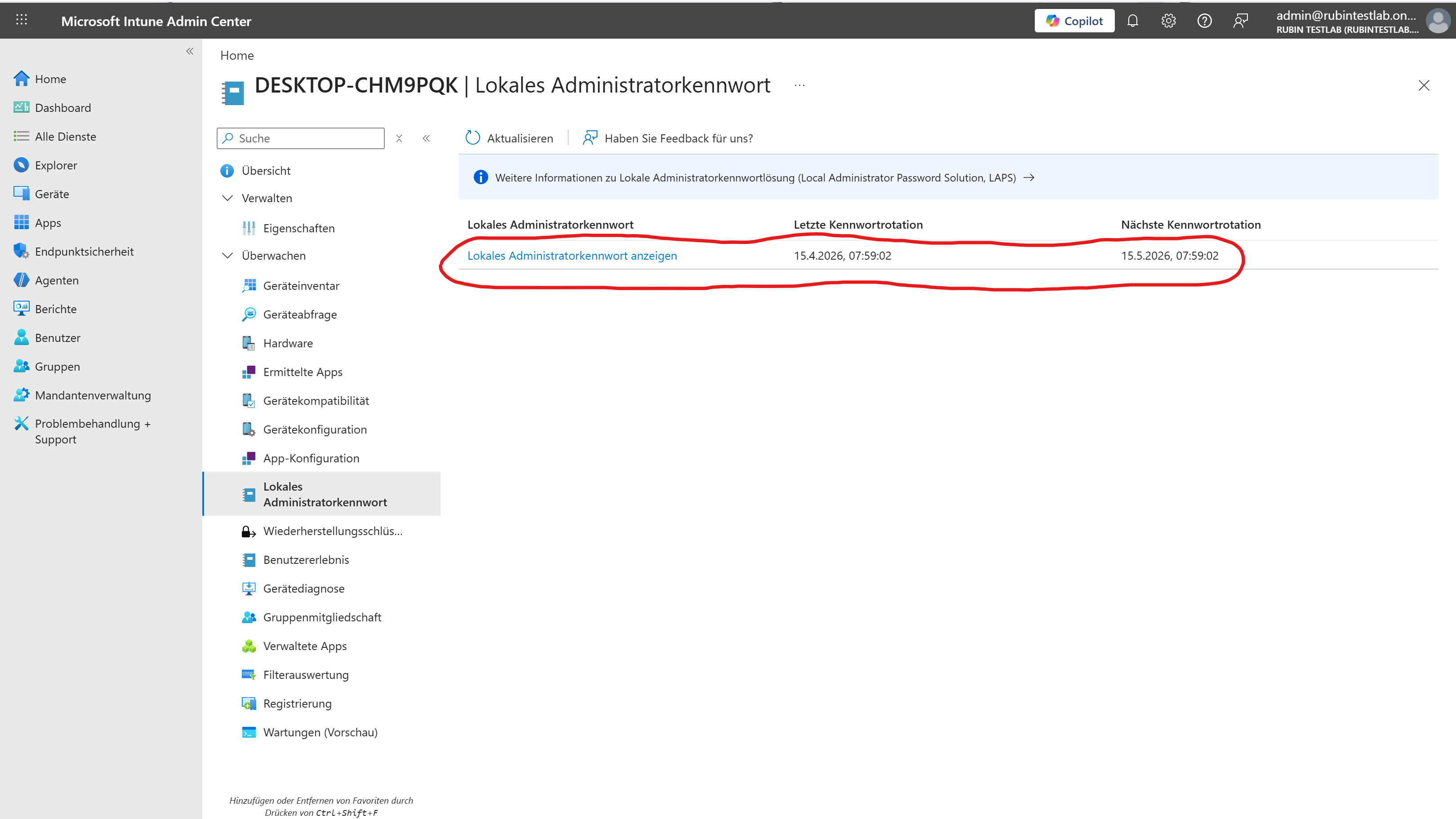 - Geräte → Alle Geräte → Gerät auswählen → … → Lokales Administratorkennwort rotieren → Ja