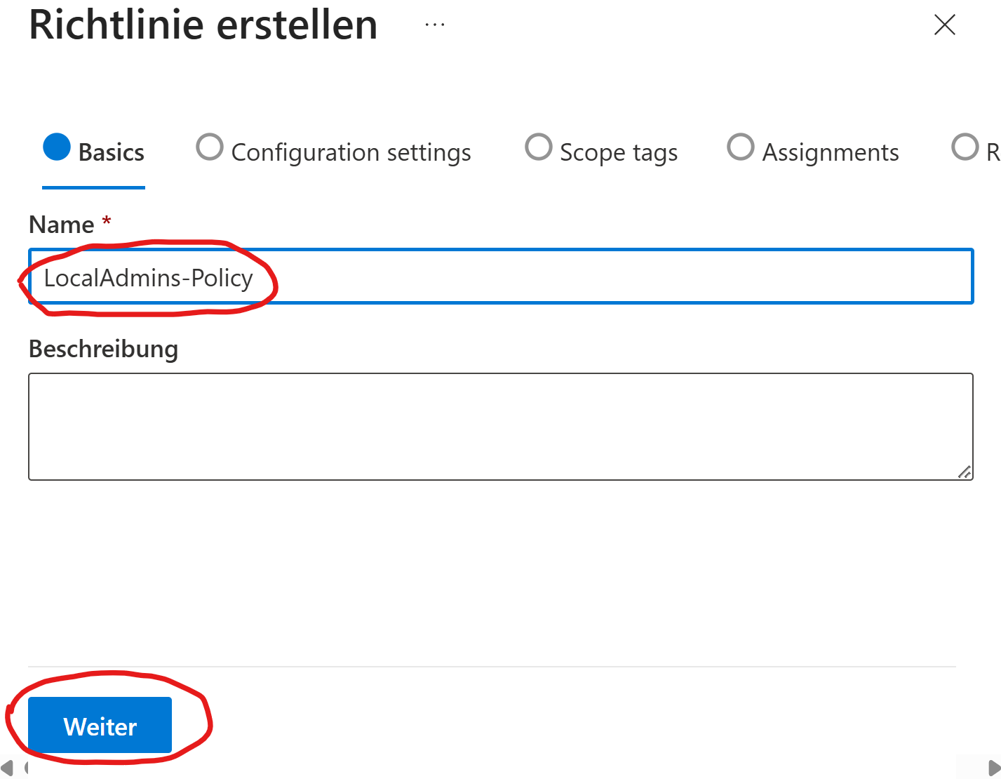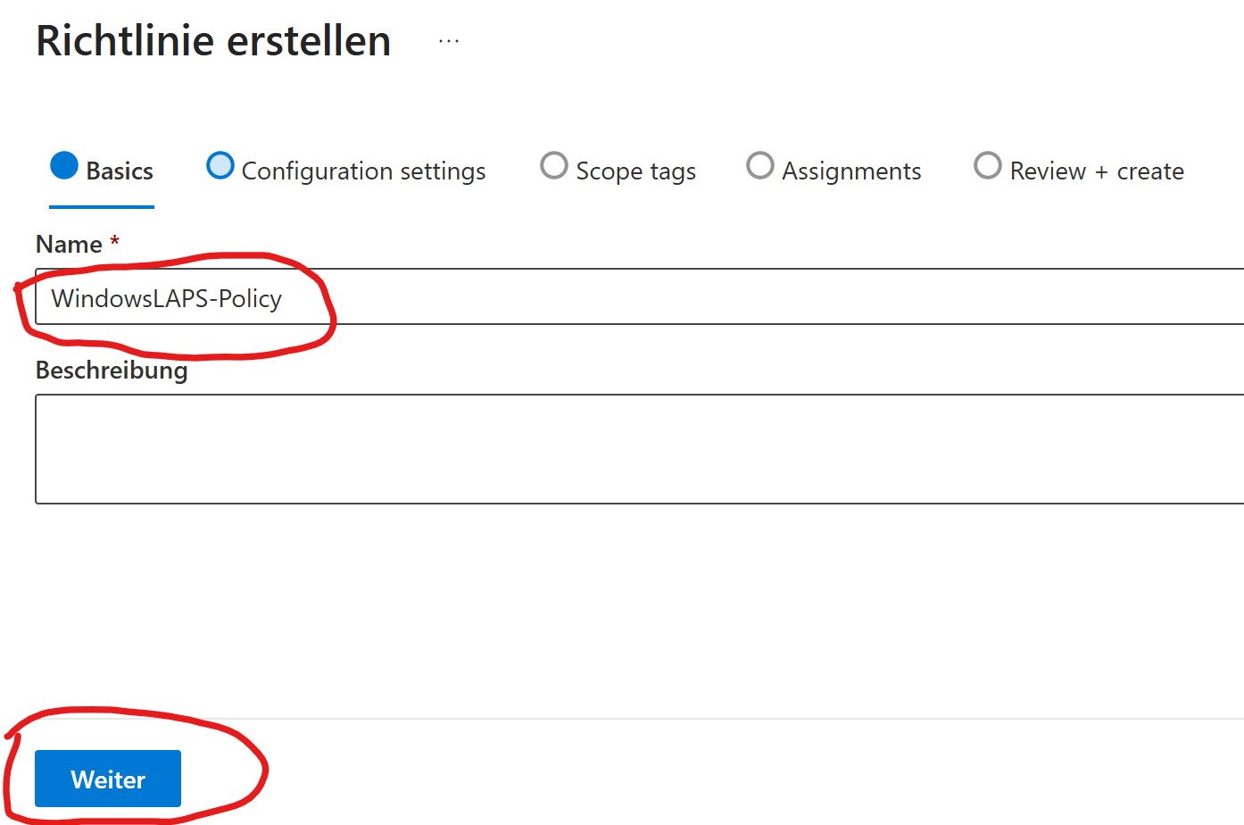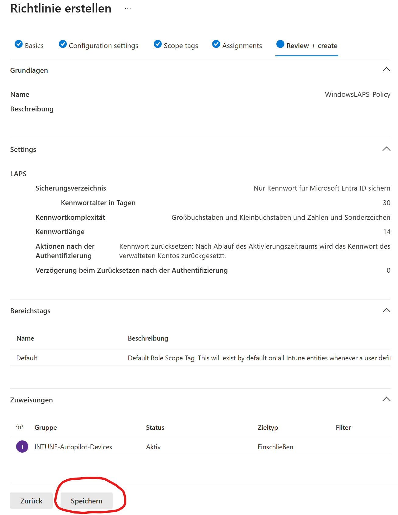 - Aktivieren der lokalen Microsoft Entra-Administratorkennwortlösung (Local Administrator Password Solution, LAPS) → Ja