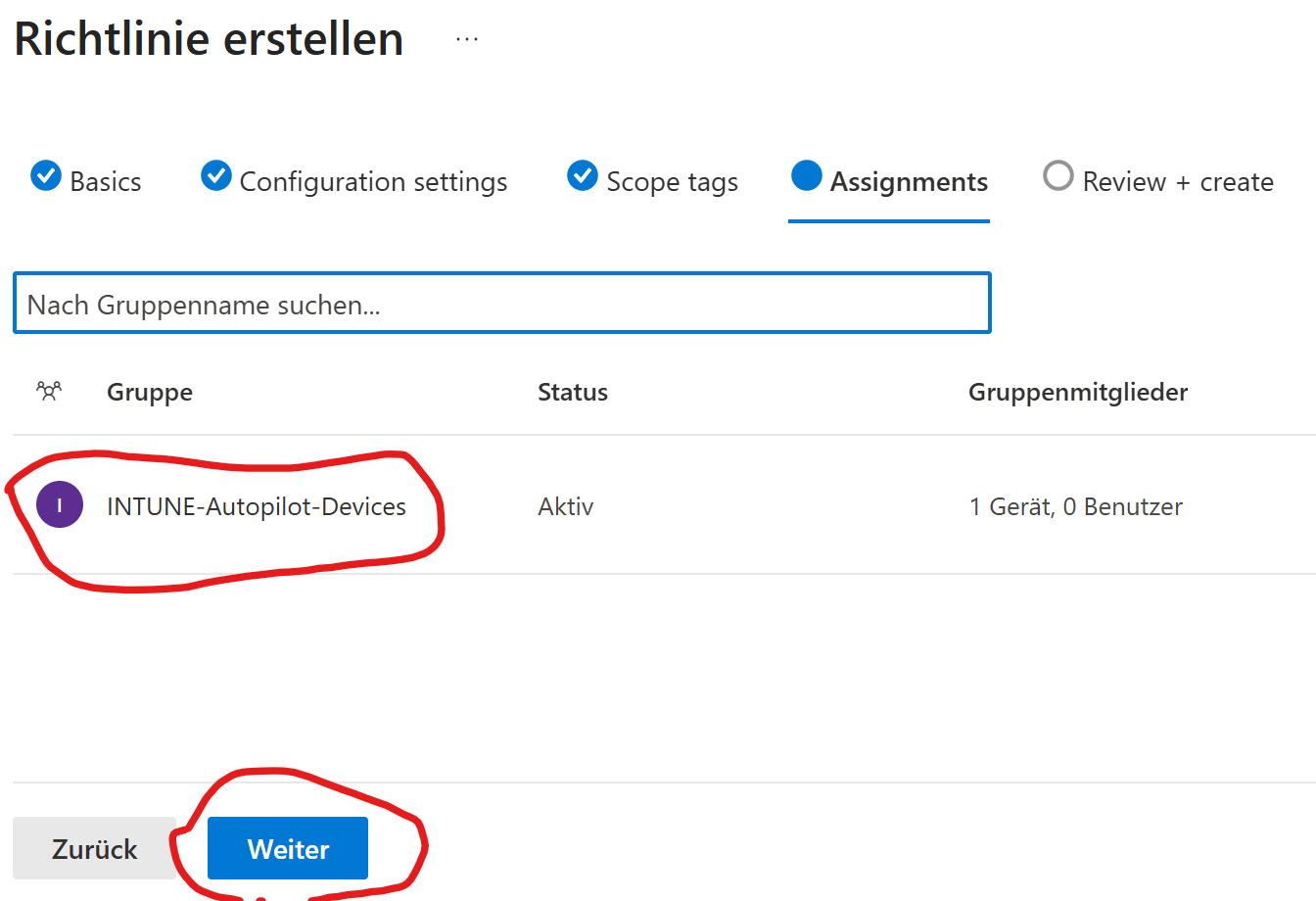 Bei Assignments wieder die Gerätegruppe auswählen: