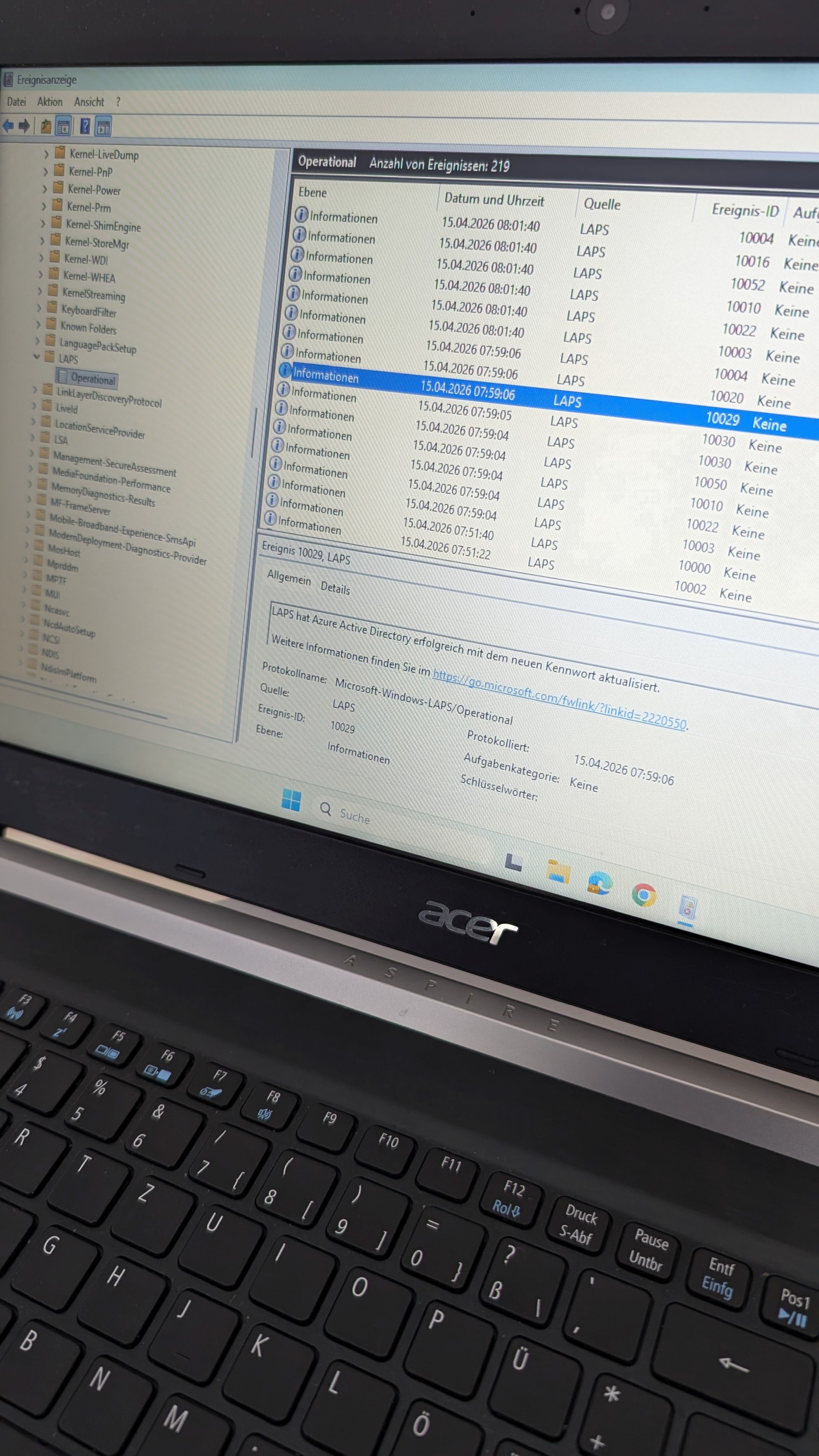 Dort ist im Protokoll Microsoft-Windows-LAPS/Operational das Ereignis mit der ID 10029 zu sehen.