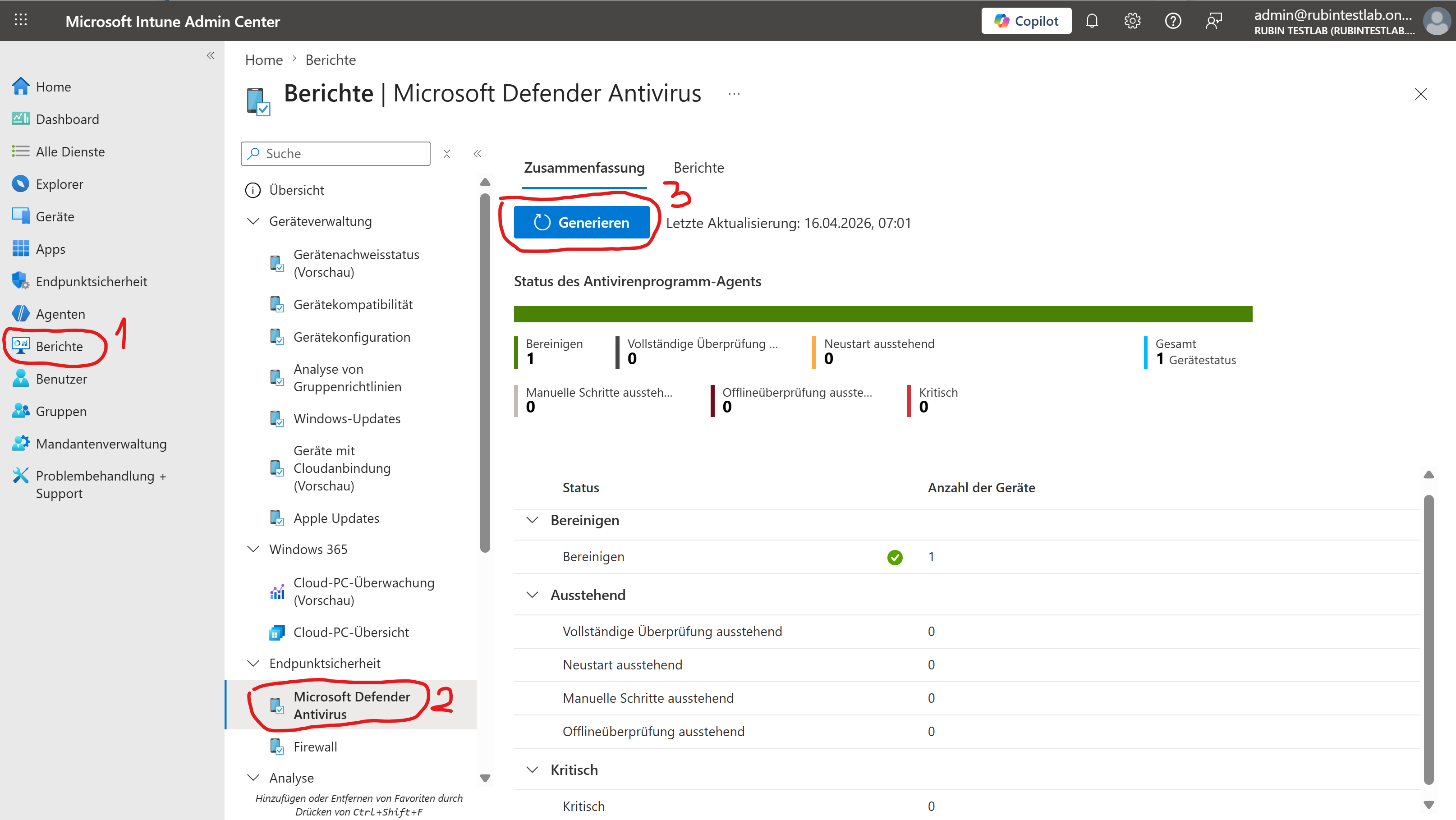 Berichte → Microsoft Defender Antivirus → Zusammenfassung → Generieren