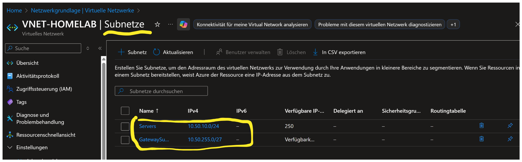 Im VNet → Subnetze