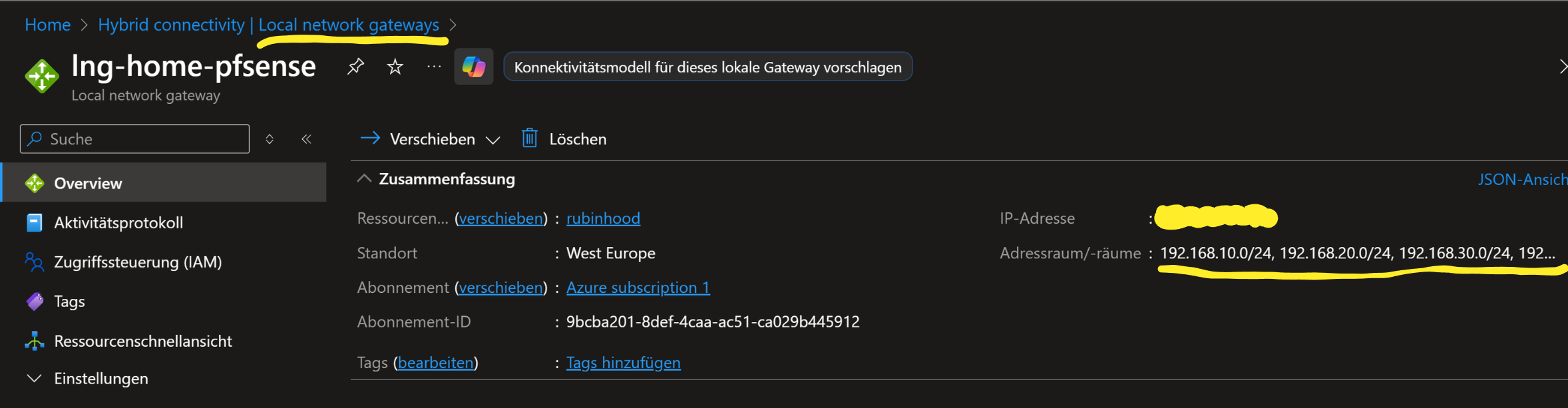 Azure muss wissen, wie dein Zuhause-Netz aussieht und über welche öffentliche IP es erreichbar ist.