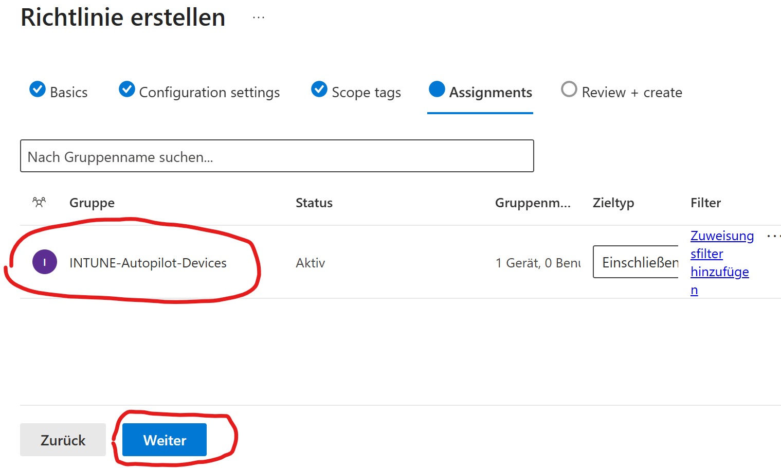 Bei Assignments wieder die Gerätegruppe auswählen: