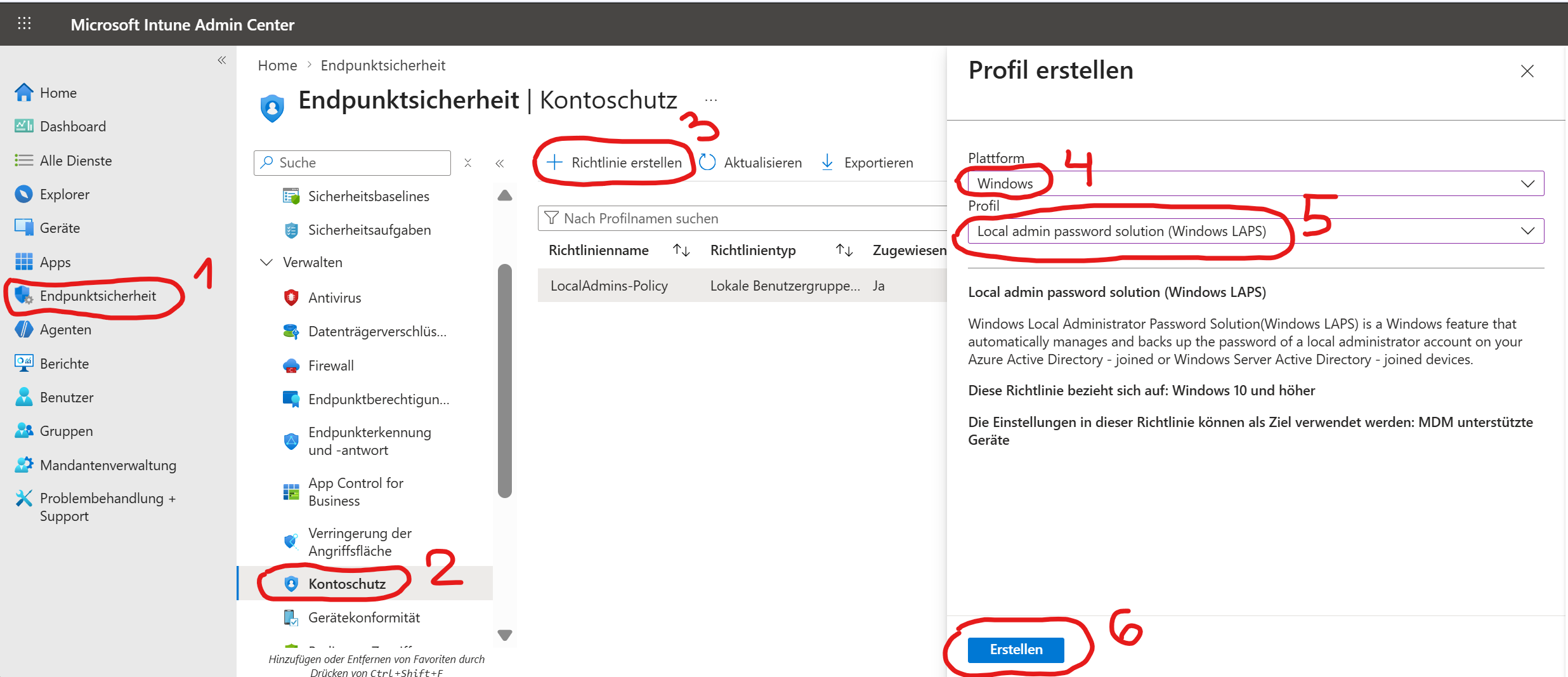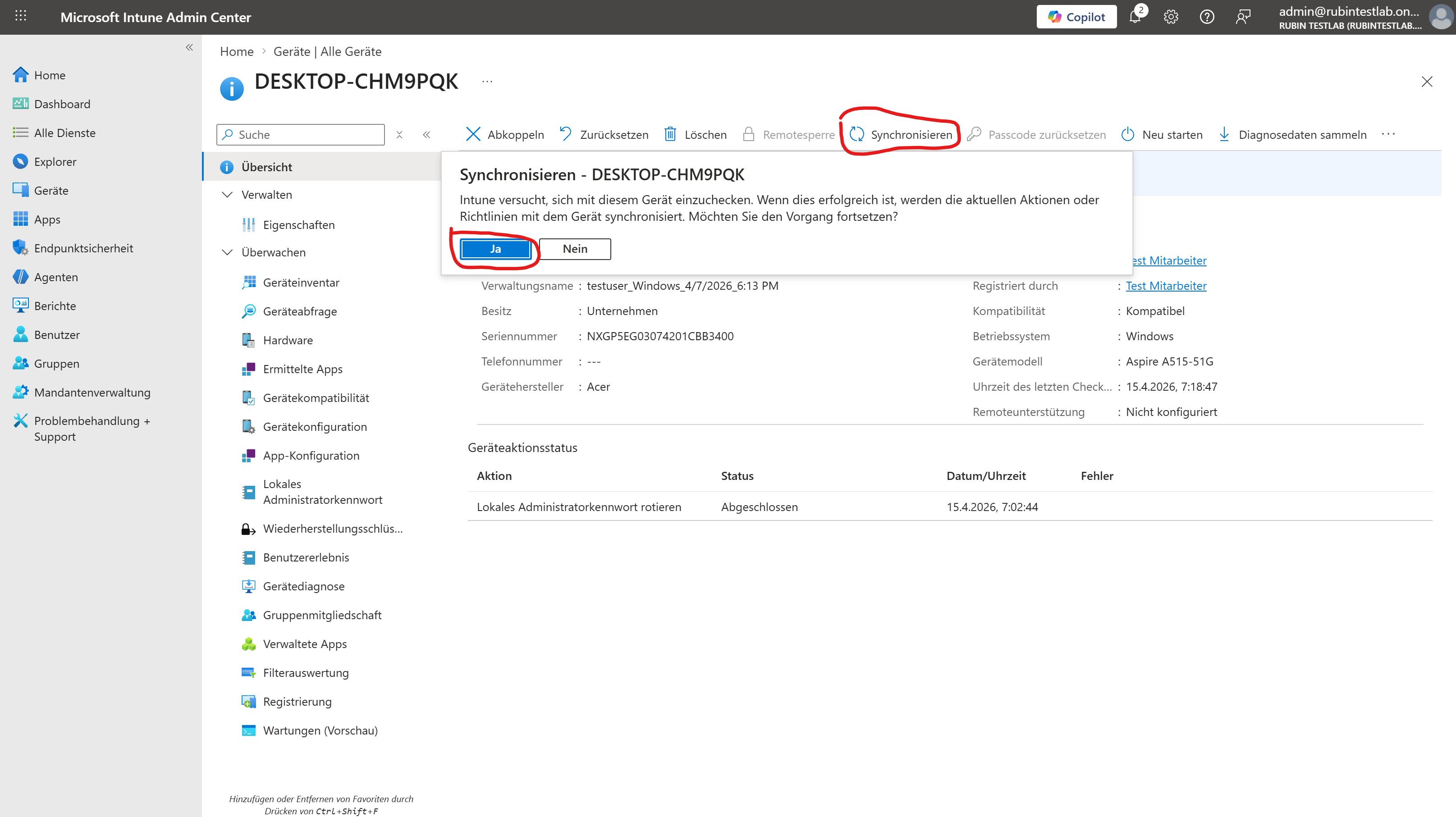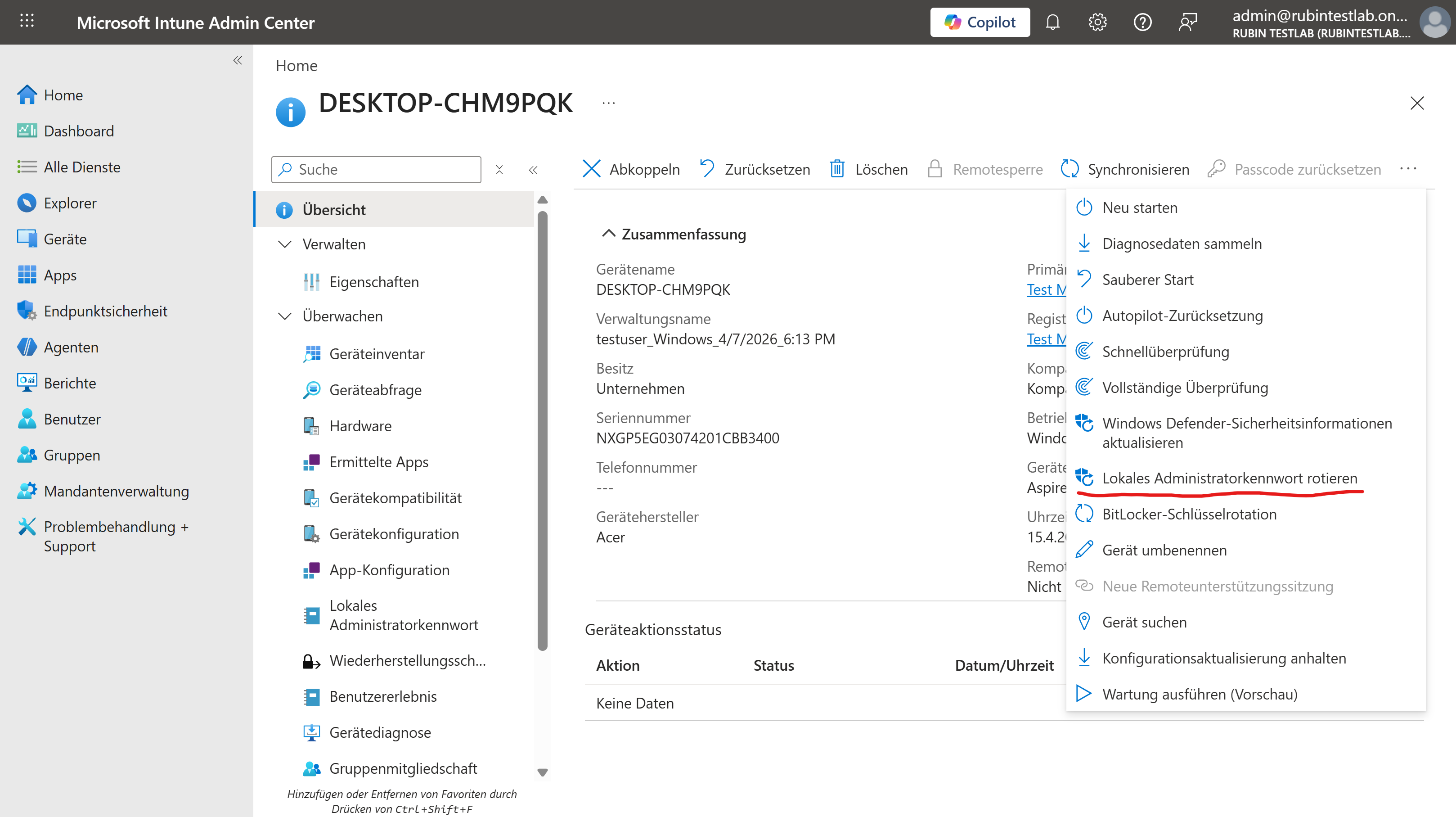 - Geräte → Alle Geräte → Gerät auswählen → … → Lokales Administratorkennwort rotieren → Ja