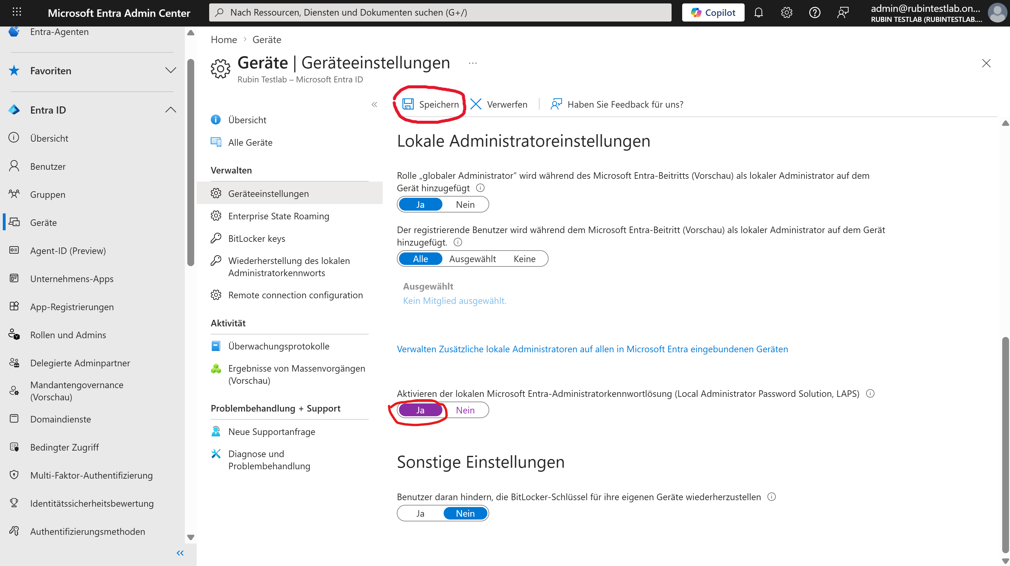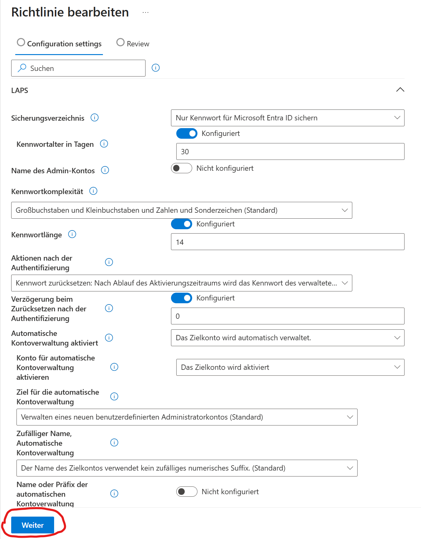 - Aktivieren der lokalen Microsoft Entra-Administratorkennwortlösung (Local Administrator Password Solution, LAPS) → Ja