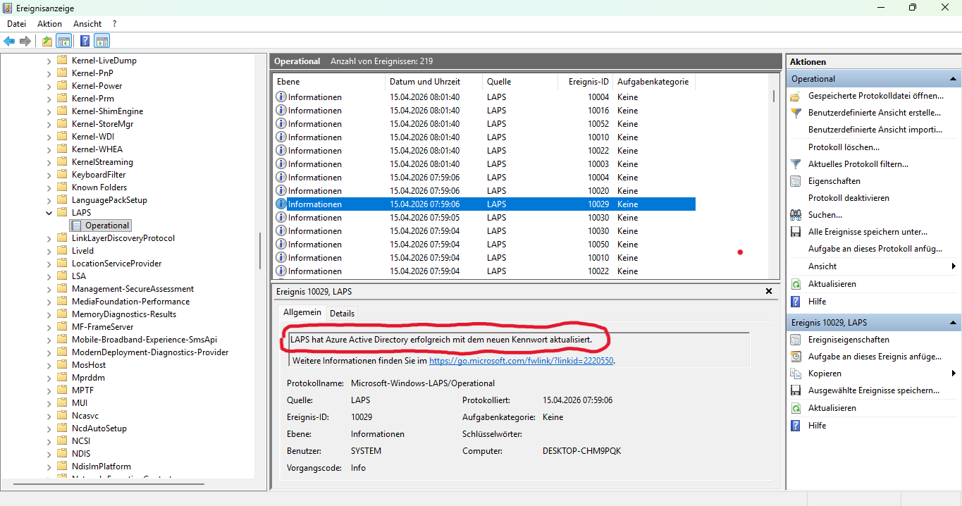Dort ist im Protokoll Microsoft-Windows-LAPS/Operational das Ereignis mit der ID 10029 zu sehen.