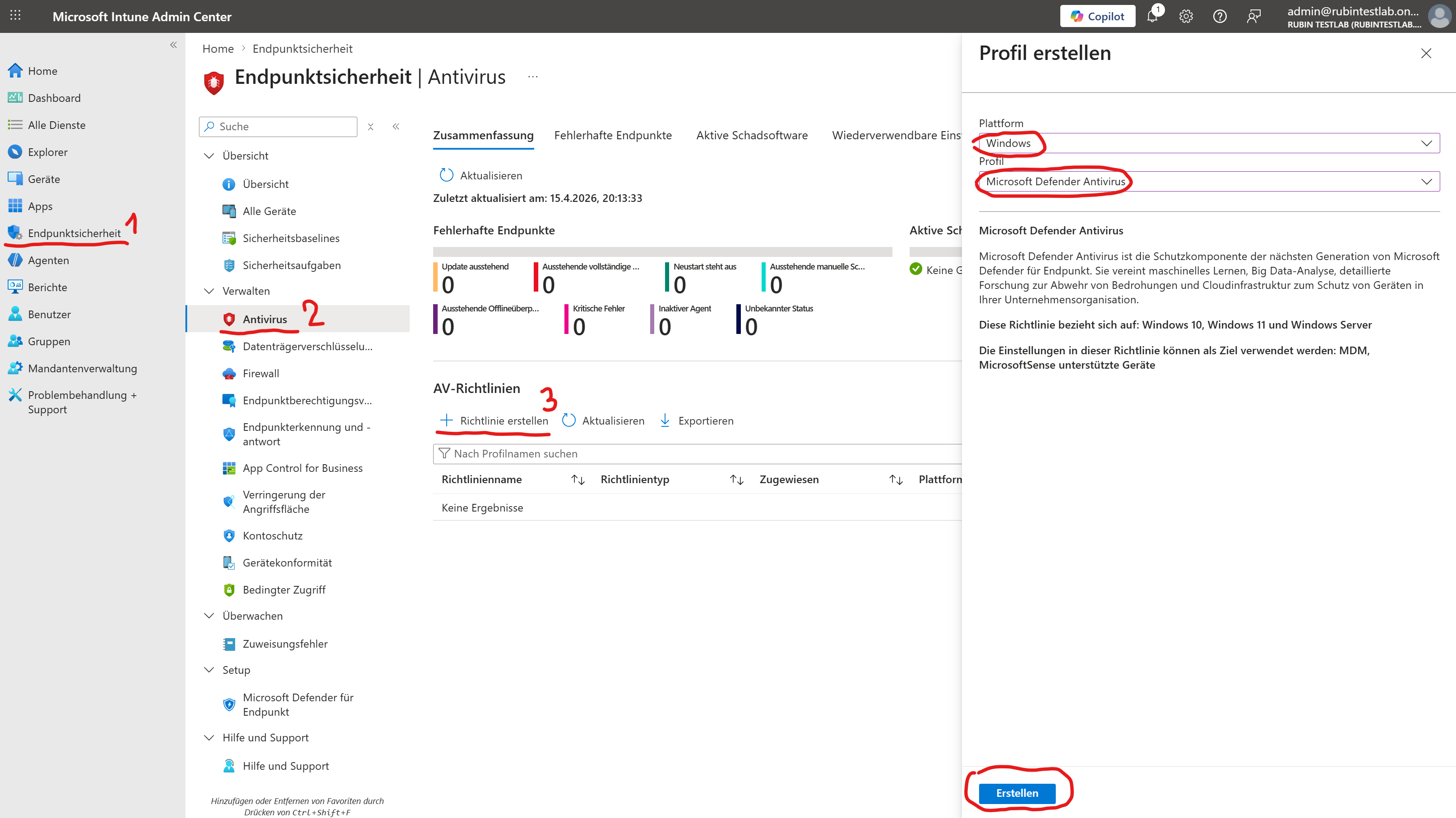 Endpunktsicherheit → Antivirus → Richtlinie erstellen