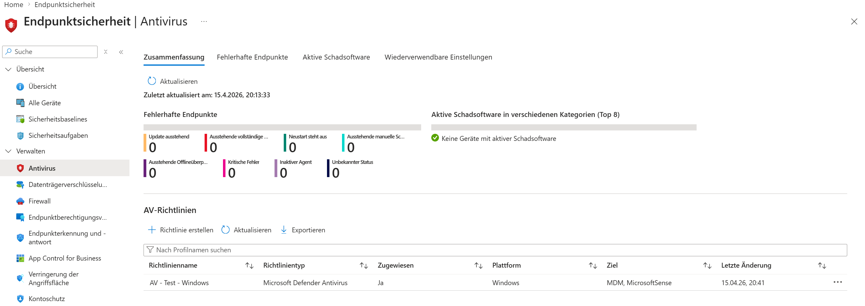 Wenn dein Windows-Gerät bereits erfolgreich in Microsoft Defender for Endpoint onboarded ist, kannst du als Nächstes eine Microsoft Defender Antivirus-Richtlinie in Intune erstellen. Damit steuerst du die wichtigsten Defender-Einstellungen zentral über das Firmenportal.